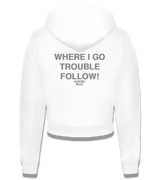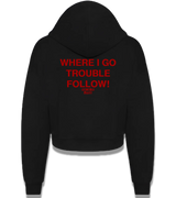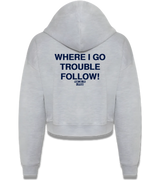 "WHERE I GO TROUBLE FOLLOW!" Cropped Zip Hoodie